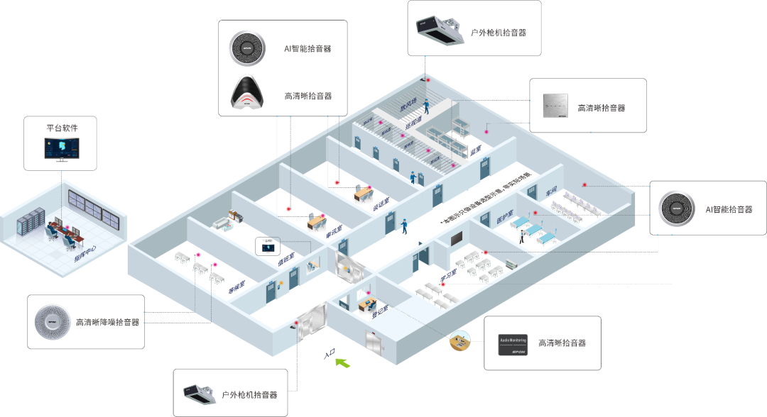 關(guān)于拾音器的設(shè)計部署指揮中心:在指揮中心部署后臺管理軟件,可以對接入的拾音設(shè)備進行狀態(tài)監(jiān)視、故障報警、軟件升級和相關(guān)性能參數(shù)調(diào)整,便于隨時掌握拾音設(shè)備運行狀態(tài)。監(jiān)室/禁閉室/等候室:監(jiān)室、禁閉室、監(jiān)獄醫(yī)院、室內(nèi)公共區(qū)域等場景,建議在此多點位部署拾音器,確保做到全天時無死角監(jiān)聽。在側(cè)墻處、天花板處安裝具備防破壞性、隱蔽性高、抗混響設(shè)備。審訊室/談話室/會見室:在審訊室、談話室、會見室等近距離桌面拾音環(huán)境,推薦在桌面部署桌面型拾音器可以有效拾取雙方近距離音源屏蔽其它音源干擾,聲音更清晰;再部署一個環(huán)境型拾音器對全室聲音進行拾取。拾音器通過與攝像頭聯(lián)動,同步錄音錄像,確保審訊/談話/會見時的錄像錄音備份公正。周界/武警崗?fù)?AB門/放風場:室外區(qū)域具有環(huán)境噪聲大、人員聚集多、晝夜溫差大、環(huán)境惡劣等特點,對于此處需要高清拾音,但傳統(tǒng)拾音器普遍效果較差無法達到理想效果。通過部署槍擊型拾音器對室外周邊區(qū)域位置進行聲音監(jiān)控。降低后期維護成本,提高工作效率。有效預(yù)防突發(fā)事件,做到事前預(yù)防、事中控制有效、事后處理規(guī)范。
