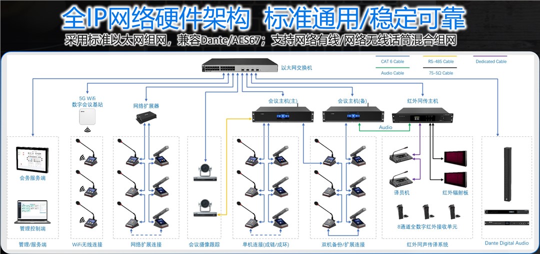 世邦系列作為新一代全數(shù)字網(wǎng)絡(luò)會議系統(tǒng),其核心優(yōu)勢在于打破了單一組網(wǎng)的束縛,實(shí)現(xiàn)了“有線(手拉手/星型)+ 無線”的多重混合組網(wǎng)模式,能夠完美應(yīng)對各種復(fù)雜場景。